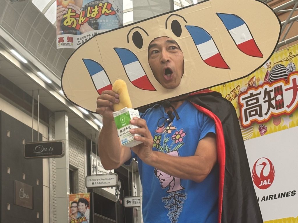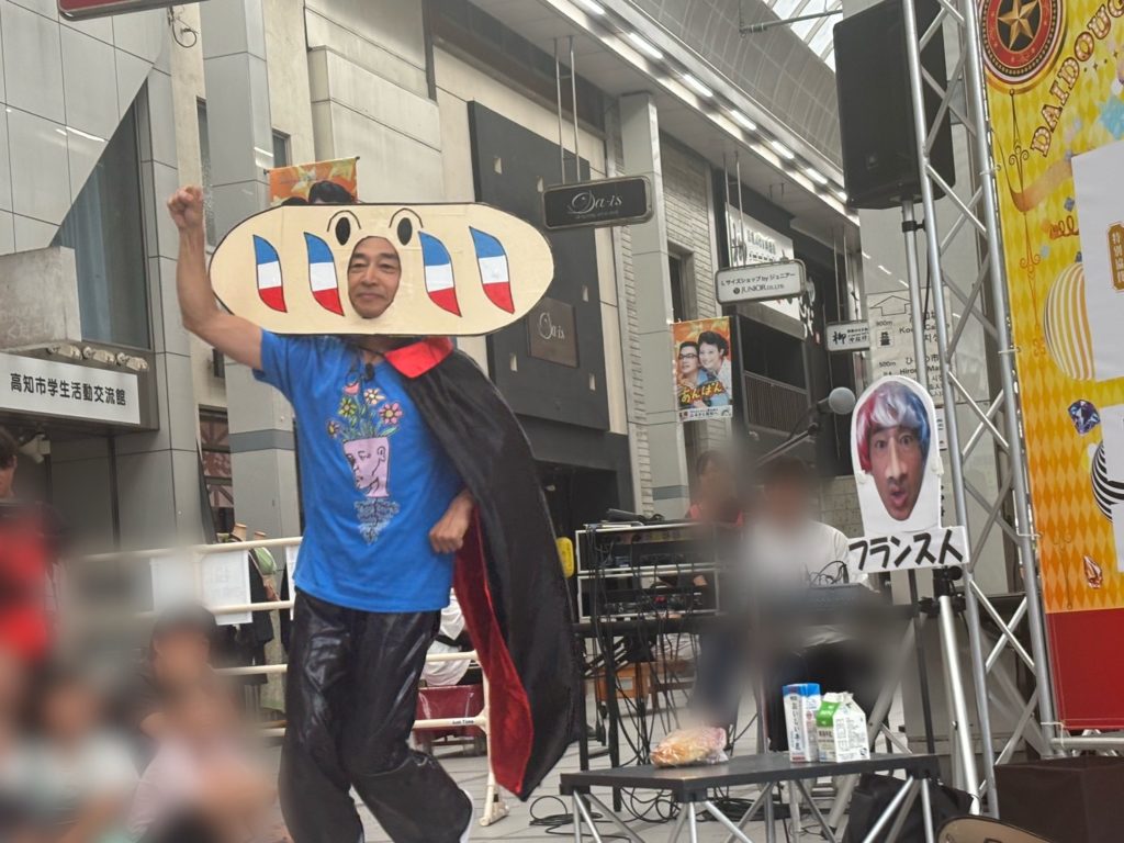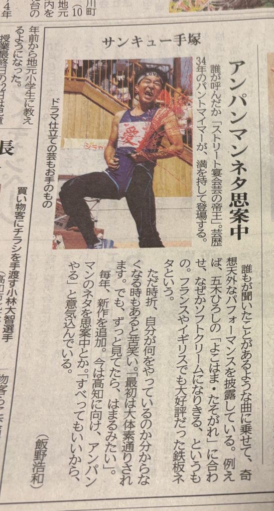 高知でのフェスティバルに初めて参加することに。プロデューサーさん曰く「満を持して」来ていただきました、と。おそらく僕のような超変化球大道芸人が来ても喜んでいただけるよう、まともなパフォーマーさんたちが地ならししてくれたのでしょう。そして、高知新聞の取材で言ってしまいました、アンパンマンやると(@@;)
